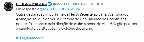 Em meio a isso, uma situação política acabou vindo à tona nos torcedores. Isso porque o ex-diretor jurídico do Corinthians, Herói Vicente, que ainda não descartou lançar uma candidatura para presidente do Clube, participou do podcast Alambrado Alvinegro, do Meu Timão. Lá, ele acabou criticando e muito um candidato. Trata-se de André Negão, que é a opção da situação. Ou seja, apoiado pelo presidente Duílio Monteiro Alves.