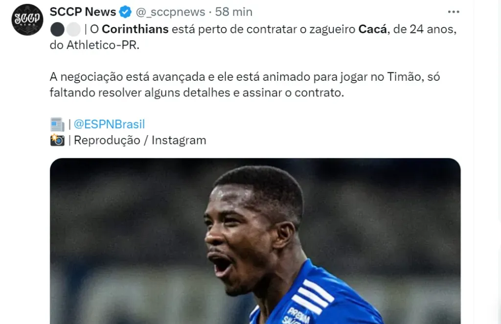 Nesta segunda-feira (19), a 11ª contratação avançou nos bastidores. De acordo com informações de Lilly Nascimento e Raul Moura, do site da ESPN, o Timão encaminhou a contratação do zagueiro Cacá.