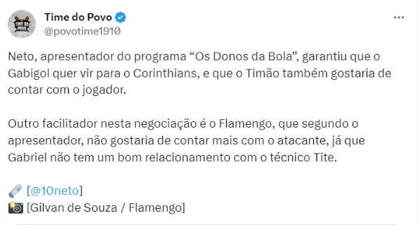 “Tem vários jogadores que têm a cara do Corinthians. Gosto de vários, que vestiriam muito bem essa camisa. O próprio Gabigol tem a cara do Corinthians, é um jogador guerreiro, sabe fazer gol”, afirmou Augusto Melo.