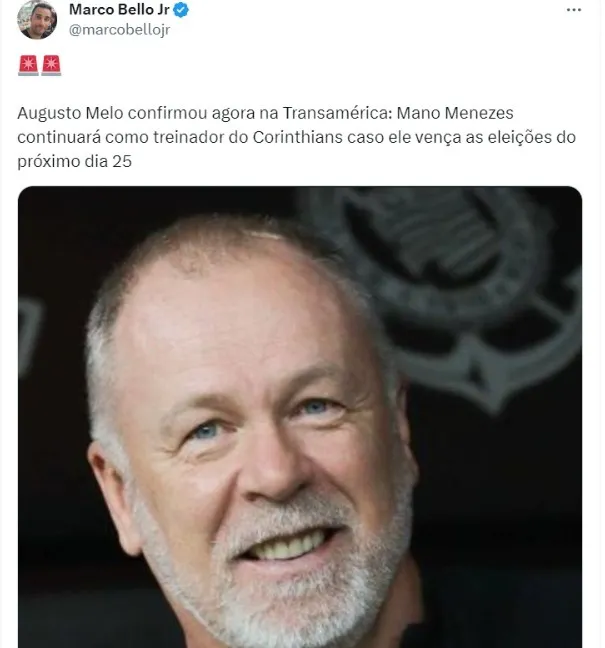 Em entrevista à Rádio Transamérica, Augusto Melo, candidato a presidente do Corinthians, acaba de confirmar quem será seu técnico.