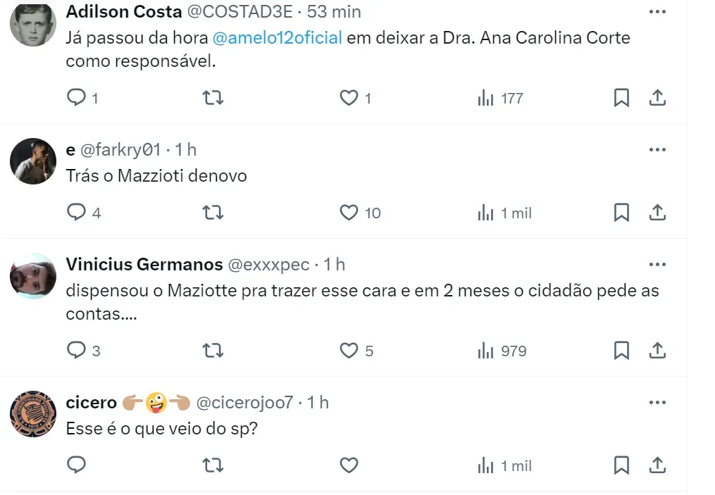 Vale reforçar que a equipe médica do Timão atualmente é composta por Ana Carolina Ramos e Côrte e Leonardo Hirao. A tendência é que a diretoria anuncie o sucessor no decorrer da próxima semana.