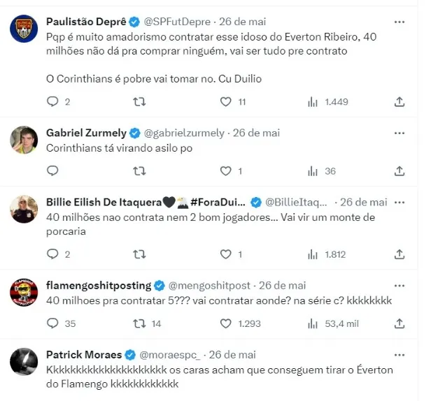 Em contato rápido com a nossa reportagem, a diretoria do Corinthians afirmou no que não tem interesse nos dois jogadores. O primeiro chegou a ser sondado, mas como dito acima renovou com Flamengo. Por outro lado, Claudinho é considerado “caro“. Augusto Melo, candidato da oposição para as eleições presidenciais foi procurado e rapidamente também negou.