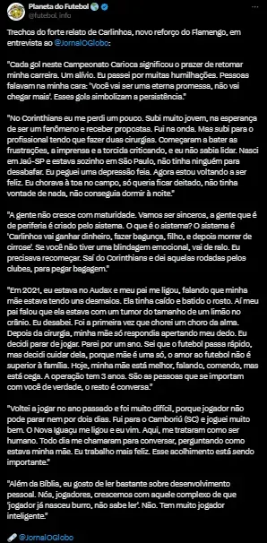 Existe uma grande expectativa para que ele repita o futebol que apresentou na Laranja Mecânica. Em entrevista para o Jornal Globo, ele fez um desabafo forte e emocionante sobre o que passou antes de dar essa volta por cima na carreira.
