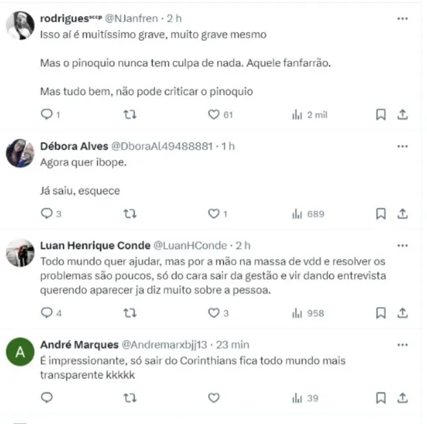 Se o diretor não estava no financeiro, ele quem mandava pagar. Se teve algum problema, por que [Rozallah] não vetou? Marcelo Mariano é um cara capacitado, está ao meu lado e é um diretor de confiança. Querem manchar nossa imagem, cinco meses de voto de confiança. Essas pessoas não querem o bem do Corinthians“, completou.