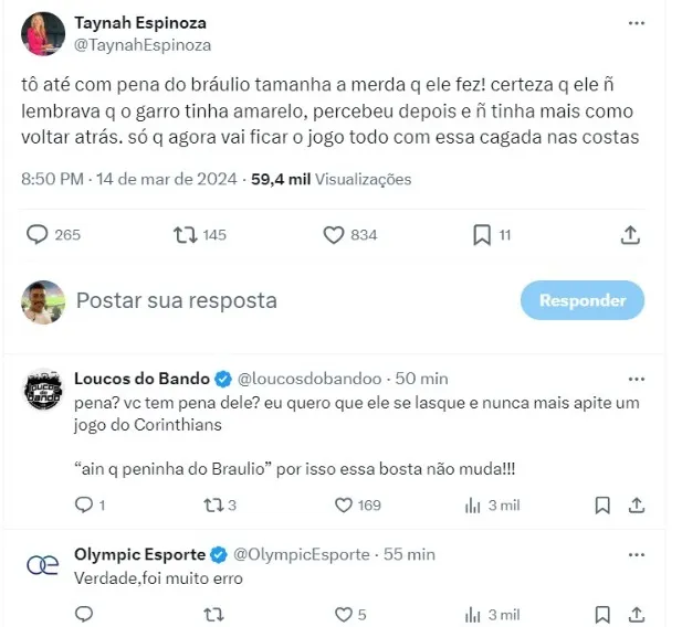 “Esse Braúlio é um dos árbitros mais vagabundos do país. Não é de hoje que esse safado prejudica o Corinthians. Foi ele quem apitou a final da CDB e não marcou pênalti contra o flamengo. É inacreditável essa EXPULSÃO do Garro. O Augusto Melo tem que soltar uma nota pós jogo”, afirmou um torcedor.