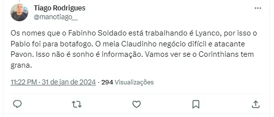 Inclusive, a informação é que tanto Fabinho, quanto Mano Menezes, fizeram apelos a Augusto Melo para que o elenco a ser formado, mesmo que seja sem estrelas, seja alinhado com o torcedor. Assim, a expectativa pelos nomes anunciados pode ser menor.