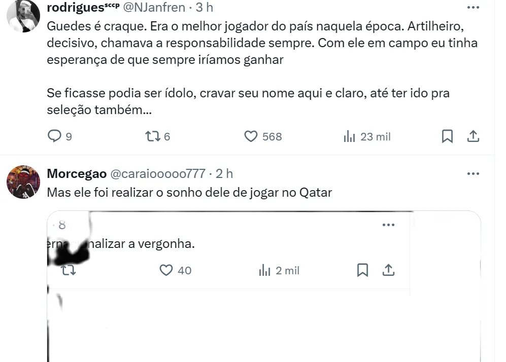 “Mas minha opinião, naquele momento, se fosse ele (Róger Guedes), eu teria ficado e buscado novos objetivos, numa Seleção Brasileira, de ser o melhor jogador do país. Eu via muito potencial no Guedes. Pra mim ele é um desperdício, com 27 anos hoje ter jogado três anos na China,… pic.twitter.com/EGMNfurw7w