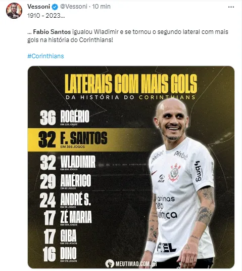 Agora o camisa 6 fica atrás apenas de Rogério, que marcou 36 gols. Sendo assim, o lateral de 38 anos que indicou aposentadoria ao fim de 2023, precisa apenas de quatro tentos para igualar o ex-atleta. Completam o top-10 de laterais artilheiros do Corinthians, os jogadores: Américo (29 gols), André Santos (24 gols), Giba (17 gols), Zé Maria (17 gols), Dino (16 gols), Coelho (15 gols), Fagner (12 gols), Gustavo Nery (11 gols) e Cláudio Mineiro (10 gols).