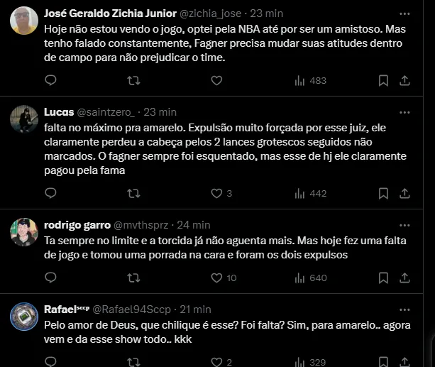 Nas redes sociais, muitos torcedores do Corinthians reclamaram de Fagner. Na visão deles, o lateral perde a cabeça muito facilmente e poderia prejudicar o Timão em um duelo mais decisivo.
