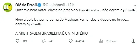 Quando o jogador do Grêmio cruza a bola e o atacante Yuri Alberto intercede o lance com a mão, na reta final do confronto, tanto o árbitro do campo quanto a cabine do VAR consideraram a jogada como legal. Porém, bastou a partida ser encerrada para a discussão tomar os debates esportivos. Em reportagem do Lance, o advogado Felipe Crisafulli, especializado em direito desportivo no escritório Ambiel Advogados, explicou o motivo que impossibilita a anulação do duelo a partir de uma regra da CBF.