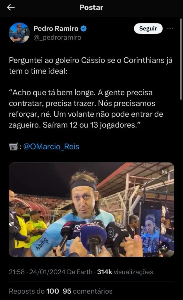 Cássio fala da atitude da torcida: “Torcida vaiou todo mundo, né? Com razão. Jogamos em time de massa e temos que dar resposta, e é com vitória. A pressão aumenta com as derrotas. No domingo tem que ir todo mundo junto, comissão técnica, o Mano, os jogadores, temos que melhorar. Quando as coisas acontecem mal, perde todo mundo. No domingo é dar uma resposta”, disse.