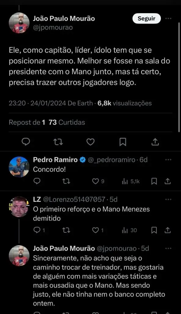 “Derrota é ruim sempre, não tem meio-termo. Como treinador, eu tenho que tirar um pouco essa questão para saber avaliar se em alguns aspectos temos melhora, o que está ocasionando esse tipo de situação. Nos jogos anteriores não tínhamos que ter perdido de jeito nenhum, foram situações pontuais, mas isso demonstra ainda uma imaturidade da equipe e não estou falando de idade, mas de construção dela”, disse Mano Menezes.