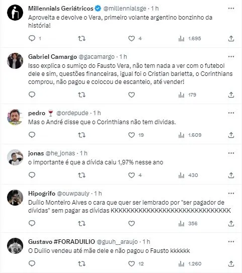 “Deveriam pagar o Fausto Vera primeiro. Estão rompidas as relações comerciais. Eles têm uma demanda na Fifa. Se não pagarem, não poderão contratar”, cravou o presidente da equipe argentina. Porém, a bravata lançada não surte efeito, pois a janela de transferências está fechada e o Corinthians pagou a parcela de julho, concluindo o acerto. Importante ressaltar, que tal quitação liberou a inscrição de Matías Rojas como jogador do Timão.