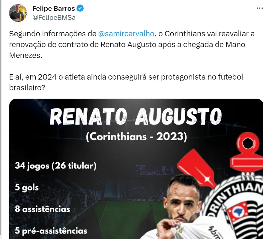 “Um dos melhores da posição no futebol brasileiro. Se o problema for só físico, eu renovaria o contrato de Renato Augusto. Agora se o problema é clínico, ele tem uma questão crônica, aparentemente ele tem um problema no joelho, se isso está aumentando, dando mais dificuldade para ele poder jogar, aí eu não renovaria o contrato dele”, disse o comentarista. Em 2023, Renato Augusto soma 5 gols e 8 assistências em 34 partidas disputadas pelo Corinthians.
