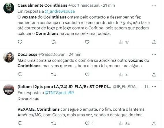“Vocês perdem e não correm, não se dedicam. Foi assim com o Lázaro, Sylvinho, Tiago Nunes, com Luxemburgo, todos eles. Será que nenhum presta? É inadmissível um time como o Corinthians tomar um sufoco do América. Vocês ganham muito dinheiro e não é possível que não se tenha um mínimo de vergonha de acabar o jogo e vocês acharem que foi legal empatar. O América merecia ganhar o jogo”, finalizou.