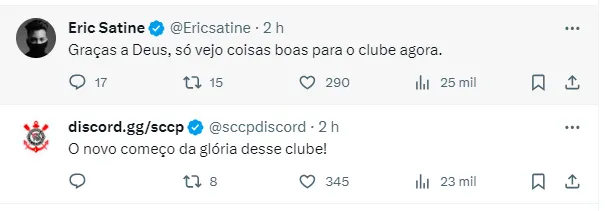 “O Corinthians terá o maior choque de gestão já visto. Como torcedor de arquibancada, estou cansado de passar pelo que passamos ontem. Esse choque será na diretoria. Amigos meus, do portão para fora. Quero pessoas técnicas no Corinthians”, disse.