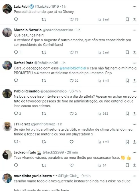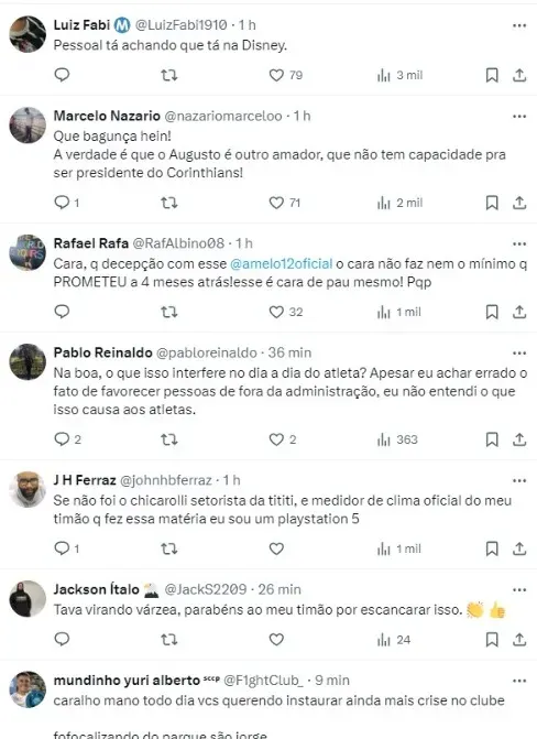 A tendência é que com esse incômodo por parte dos atletas, conhecidos e familiares de Augusto Melo não frequentem mais as dependências do Corinthians, seja o CT, a Neo Química Arena e o Parque São Jorge.