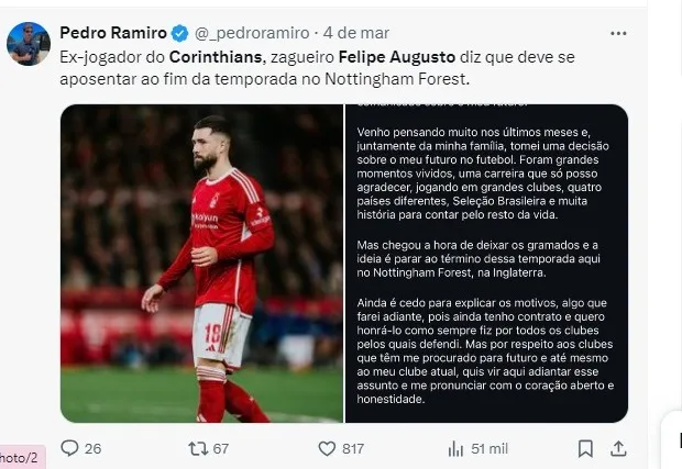 Por fim, vale lembrar que Felipe foi sondado pelo Corinthians ano passado. As negociações não andaram e o zagueiro seguiu atuando na Europa antes de anunciar sua aposentadoria que aconteceu neste domingo na última rodada da Premier League.