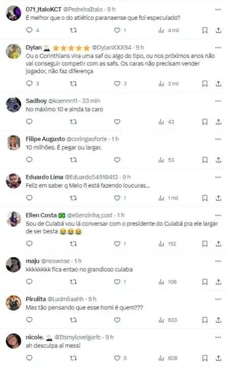 “A gente tem algumas conversas bem superficiais, nada concreto ainda. Tivemos uma proposta informal também, não chegou diretamente do Corinthians, mas um valor que a gente considera baixo“, disse, completando:
