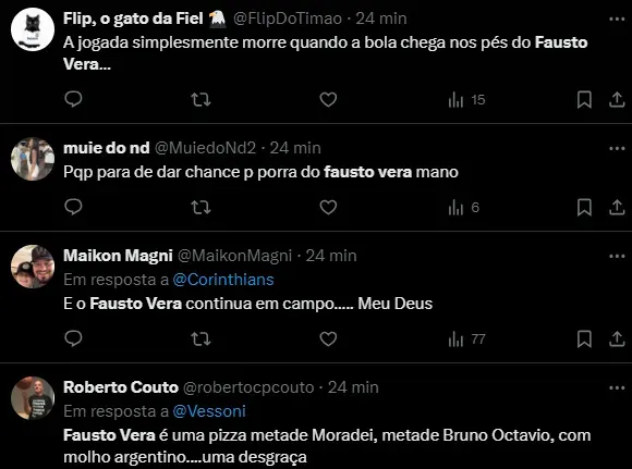 “Tira o Fausto Vera pelo amor de Deus! Jogar com ele é jogar com 1 a menos”, “Não aguento mais o Fausto Vera”, “A gente vai ser forçado a ver 90 minutos de Fausto Vera?” e “A jogada simplesmente morre quando a bola chega no Fausto Vera…”, foram alguns comentários.