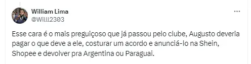 “Esse cara é o mais preguiçoso que já passou pelo clube, Augusto deveria pagar o que deve a ele, costurar um acordo e anunciá-lo na Shein, Shopee e devolver pra Argentina ou Paraguai”, disse outro membro da Fiel.