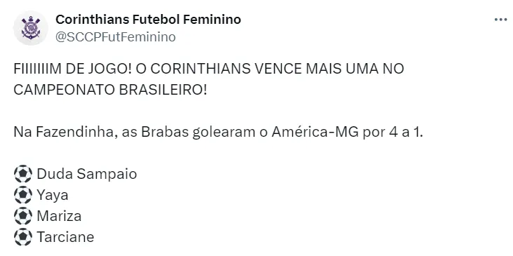 O Corinthians segue invicto no Campeonato Brasileiro. Na última rodada, as Brabas, que são tricampeãs, levaram a melhor diante do América-MG, vencendo por 4 a 1. A artilheira do time é a atacante Millene, com dois gols.