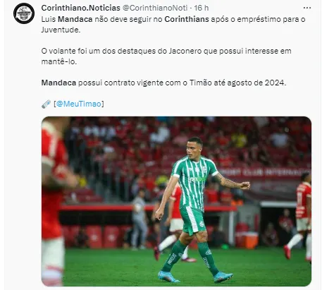 De acordo com informações da equipe de reportagem do site Meu Timão, o jovem meio-campista Mandaca, que estava emprestado ao Juventude neste ano, já foi comunicado que não vai ficar.