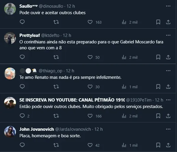 Dito isso, por mais que o Alvinegro do Parque São Jorge esteja cinco pontos distante do Z-4, a situação na tabela vem gerando algumas críticas, o que deixa até o meia Renato Augusto com o destino indefinido em Itaquera.