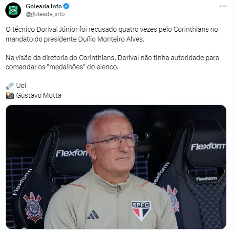 “O técnico Dorival Júnior, que conquistou o título da Copa do Brasil, inédito para o São Paulo neste fim de semana, foi recusado quatro vezes pelo Corinthians no mandato do presidente Duílio Monteiro Alves”, informou o colunista do site Uol.