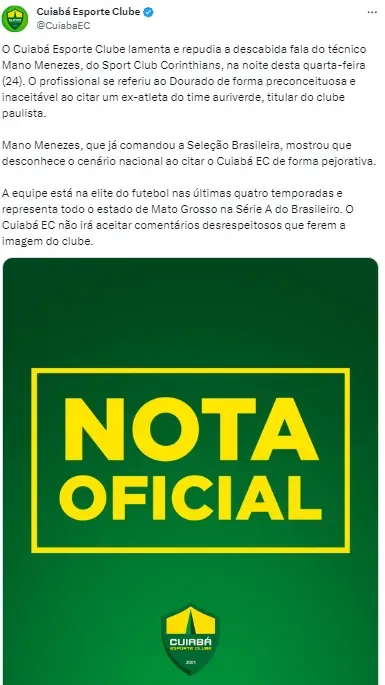 “O Cuiabá Esporte Clube lamenta e repudia a descabida fala do técnico Mano Menezes, do Sport Club Corinthians, na noite desta quarta-feira (24). O profissional se referiu ao Dourado de forma preconceituosa e inaceitável ao citar um ex-atleta do time auriverde, titular do clube paulista”, iniciou o texto.