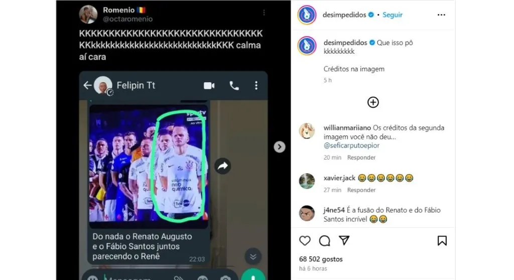A imagem em questão que circulou nas redes sociais, na página do Desimpedidos no Instagram, chegou até Renê, que fez um comentário entrando na brincadeira com os torcedores.
