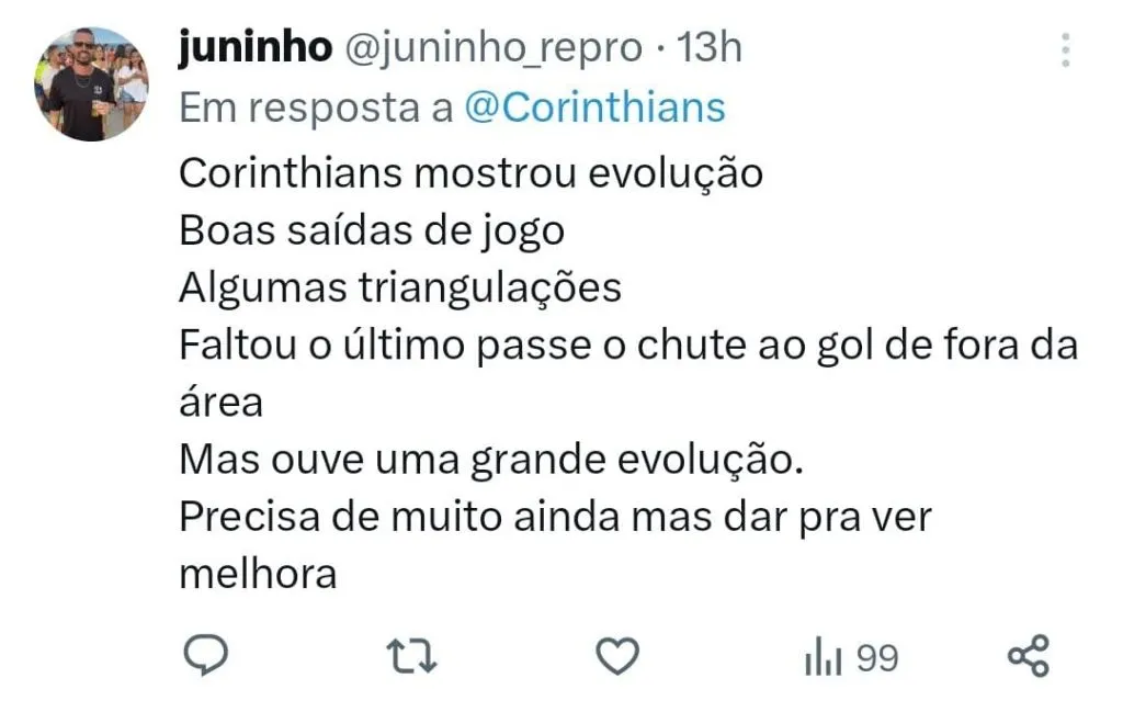 Apesar de ter se distanciado da zona de rebaixamento, a atuação do Corinthians não conseguiu convencer a todos. Segundo a avaliação do jornalista Renato Mauricio Prado (RMP), o desempenho do alvinegro melhorou com a chegada de Mano Menezes, todavia ainda está longe de ser uma atuação que agradável de se ver. RMP não poupou críticas ao presidente do Clube.