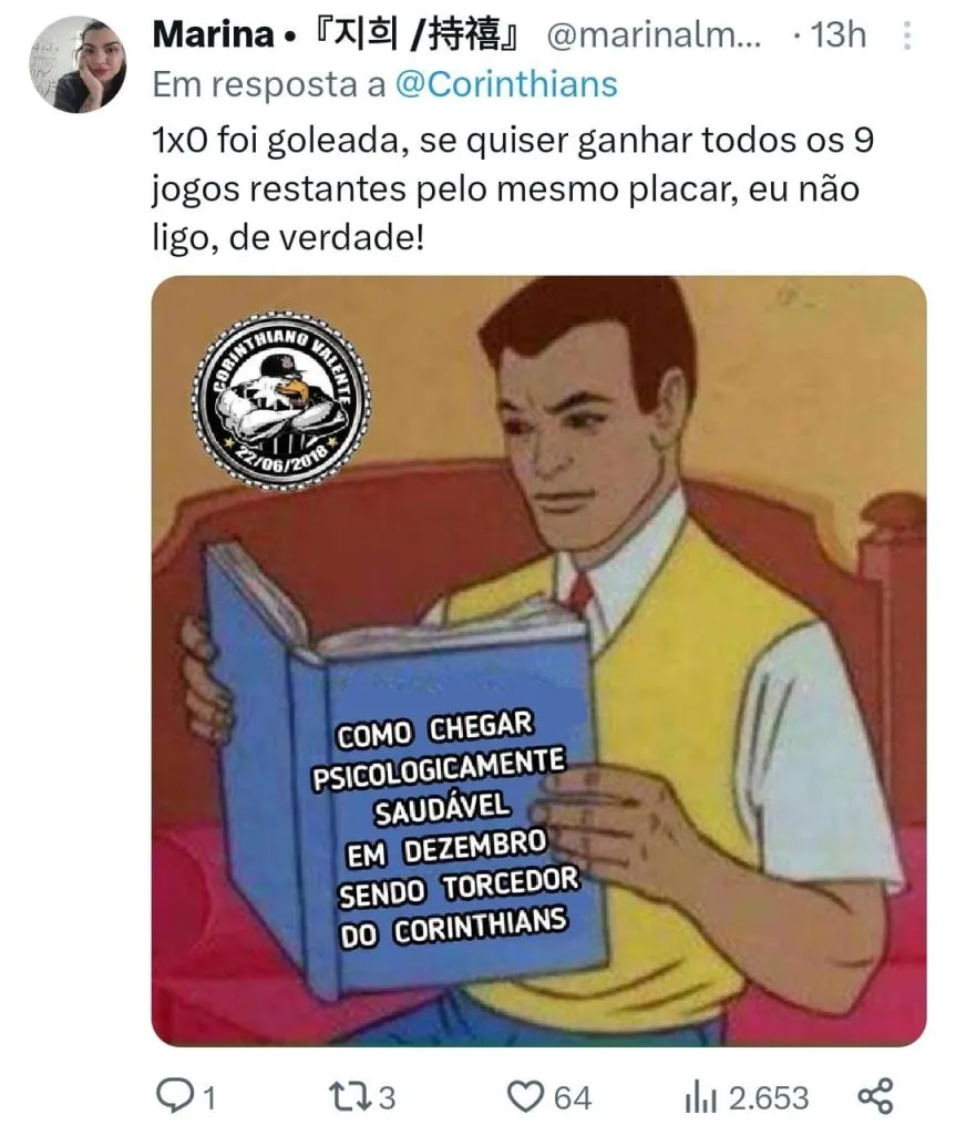 “Não dá para se empolgar com o futebolzinho mequetrefe que o Corinthians está jogando esse ano. A temporada inteira o futebolzinho do Corinthians é pra lá de mequetrefe, seja com Luxemburgo, seja com Mano. Acho que com o Mano deu uma leve melhorada, mas ainda é um jogo difícil, duro de ver, dói os olhos. E outra coisa, tudo que o Corinthians está brigando esse ano é para não cair, o Duilio realmente vai se consolidando como um dos piores senão o pior presidente da história do Corinthians”, analisou durante participação no Uol News Esporte.