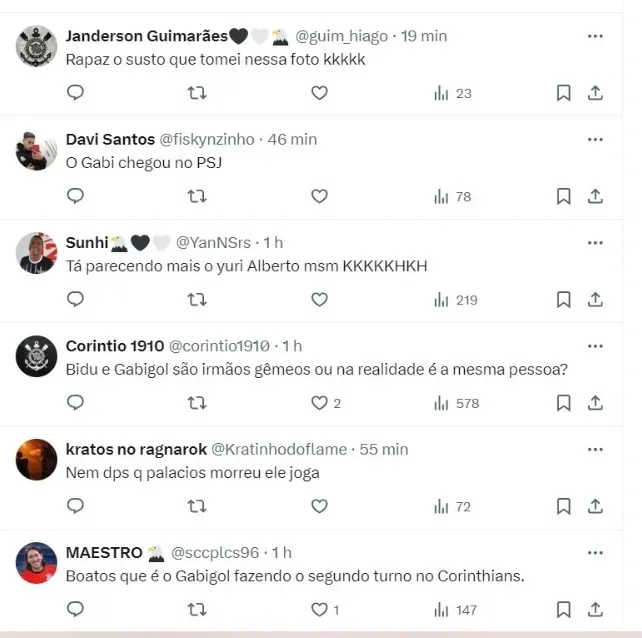 “Boatos que é o Gabigol fazendo o segundo turno no Corinthians” – “Bidu e Gabigol são irmãos gêmeos ou na realidade é a mesma pessoa?”, brincou dois torcedores nos comentários da foto no X.