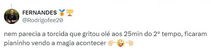 “Muito feliz. A felicidade é minha e se leva para a equipe. Pudemos empatar um jogo difícil, em um campo difícil. Quero mencionar minha família, muito feliz por esse empate que tem um sabor de vitória porque empatamos com dois a menos, e não é pouca coisa”, disse ao Paulistão Play.