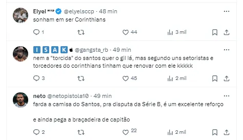 De acordo com informações publicadas pelo Uol, pelos jornalistas Lucas Musetti e Gabriela Arantes, o Santos, que foi rebaixado para a Série B do Campeonato Brasileiro, surgiu como interessado em Gil.