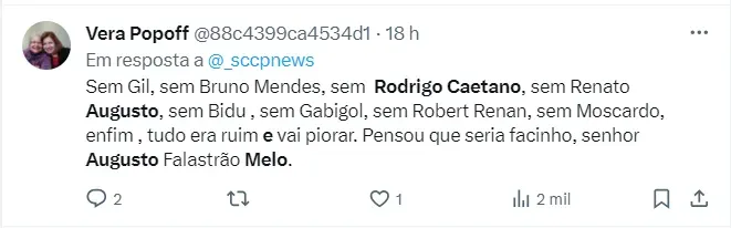 Neste sábado (16), por meio de sua assessoria de imprensa, Rodrigo Caetano desmentiu a versão dada por Augusto Melo pela razão do não acerto, reiterando que “nunca negociou com o Corinthians”, e que, “não houve nenhuma conversa sobre forma de trabalho ou hierarquia dentro do clube”.