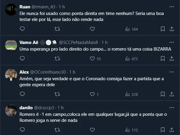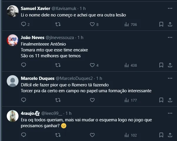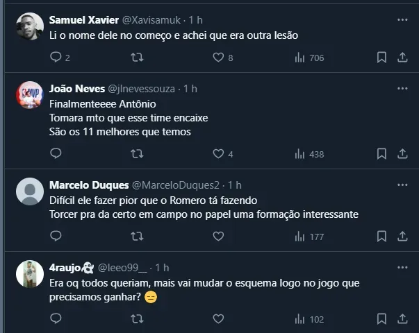 Posto isso, por mais que o camisa 11 seja ídolo da torcida, a informação chegou até os corintianos e a possível mudança de António Oliveira foi aprovada, como você pode conferir na repercussão abaixo.