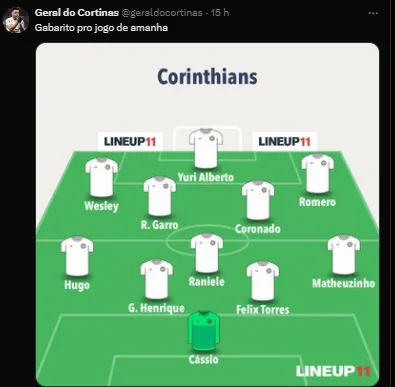 Segundo o GE, para este duelo contra o Juventude, a provável escalação do Timão deve ter: Cássio, Fagner, Félix Torres, Gustavo Henrique e Hugo; Raniele, Maycon ou Fausto Vera e Rodrigo Garro; Romero, Wesley ou Igor Coronado e Yuri Alberto.