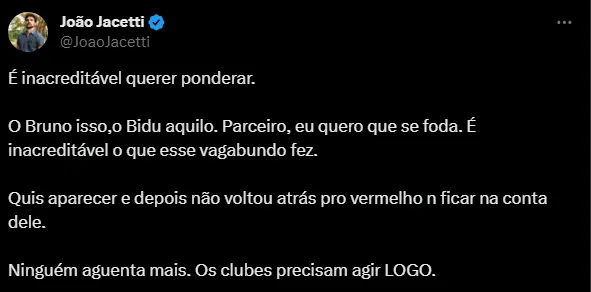 “É inacreditável o que esse vagabundo fez. Quis aparecer e depois não voltou atrás pro vermelho n ficar na conta dele”, “A carga aconteceu e prejudicou o Bidu. ASSALTO NO SUL” e “O Pênalti no Bidu foi vergonhoso”, foram alguns dos comentários.