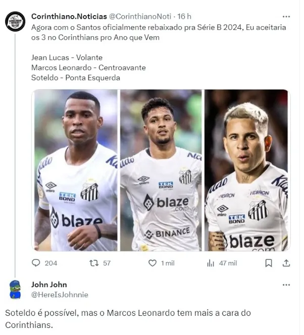 “Estou só citando um exemplo, porque tem contrato e o salário dele é muito alto, mas é um jogador que gosto. O Soteldo é um jogador muito bom, o Marcos Leonardo, enfim, tem muitos que a gente gosta”, listou Augusto Melo, em entrevista para a Rádio Bandeirantes.