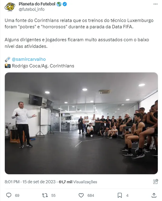 Em informação dada pelo jornalista Samir Carvalho, pessoas de dentro do Clube estariam bastante insatisfeitas com os treinos passados por Luxemburgo. Um caso específico em que esse incômodo surgiu foi durante os jogos das Eliminatórias da Copa, quando o calendário brasileiro parou e o Timão pôde focar nas atividades do CT. Nesse período, as pessoas ouvidas por Samir Carvalho teriam classificado os treinos de Luxemburgo como “pobres” e “horrorosos”.