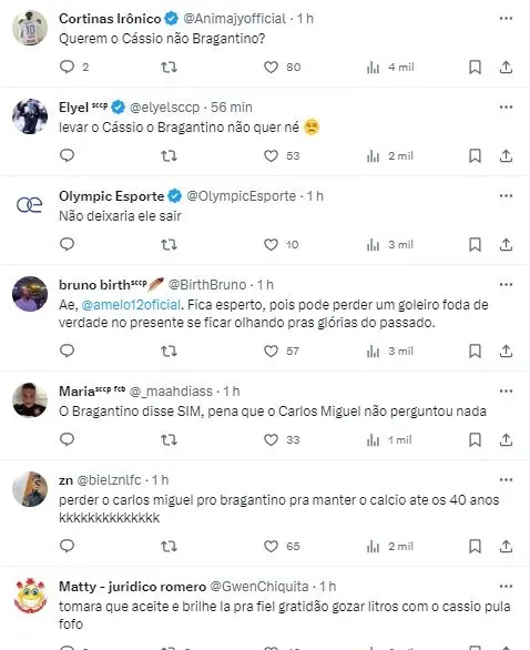 Vale destacar o que pensa o presidente Augusto Melo sobre o arqueiro reserva do Coringão: “Fico muito feliz que o Corinthians esteja muito bem servido de goleiros. O Carlos Miguel também é um excelente goleiro, tem contrato e queremos que permaneça. O Cássio já tem certa idade, e o Carlos Miguel tem que estar preparado para isso”.