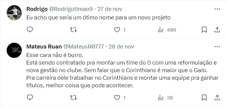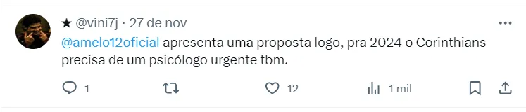 Augusto Melo já dá a chegada dele como certa na equipe paulista para a próxima semana. Mas, vale destacar, que apesar do entusiasmo do mandatário, não tem nada assinado entre as partes, mas segue confiante com o acerto para o próximo ano.