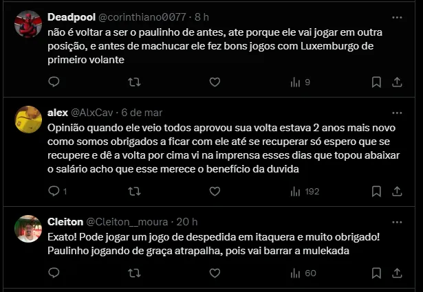 Com esse período sem jogos oficiais, afinal, a equipe já está eliminada do Campeonato Paulista, Paulinho terá tempo para ficar 100% fisicamente e voltar a jogar após um logo tempo.