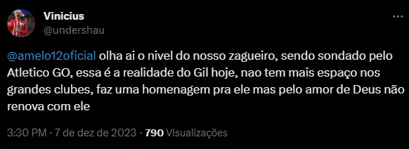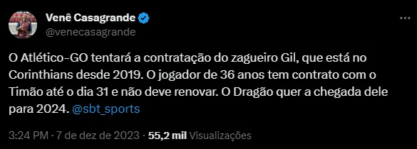 De acordo com o jornalista Venê Casagrande, o Atlético-GO, um dos clubes que subiram à Série A do Brasileirão, está interessado na contratação de Gil. O Dragão é comandado pelo técnico Jair Ventura.