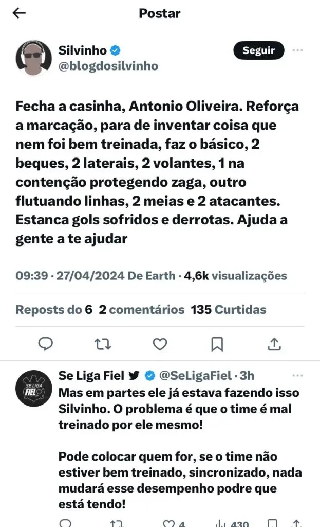 A intenção de Augusto Melo é seguir com o português no comando do time. Porém, ele sabe que o recado do estádio vale muito dentro do Clube. Caso a equipe não vença, a pressão vai aumentar.