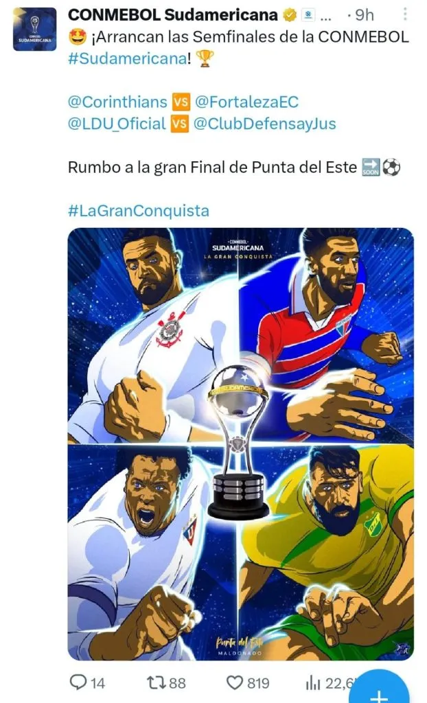 “Esse é um processo, começamos a jogar torneios internacionais em 2020. A gente vem aprendendo jogar esse tipo de competição. Acho que o Corinthians é o favorito pela história, tradição, rodagem em competições internacionais. Mas chegamos com bons resultados nessa Sul-Americana. É a melhor campanha entre os quatro times que estão na semifinal, mas isso não nos dá o favoritismo para o duelo. É muito difícil, jogo de alto nível, e sabemos que o Corinthians é muito forte lá dentro (Neo Química Arena)”, disse o mandatário em entrevista à ESPN.