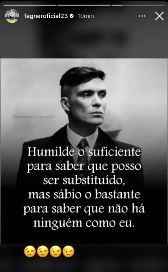 “Humilde o suficiente para saber que posso ser substituído, mas sábio o bastante para saber que não há ninguém como eu”, escreveu Fagner no story de seu Instagram. O lateral ilustrou sua reflexão com a foto do ator Cillian Murphy. Fagner passa por uma temporada muito oscilante, enfrentando problema muscular que o tirou de partidas durante 2023. Ao todo, ele entrou em campo em 45 jogos, o que significa 75% dos jogos do Coringão na temporada. As informações são do portal Meu Timão.
