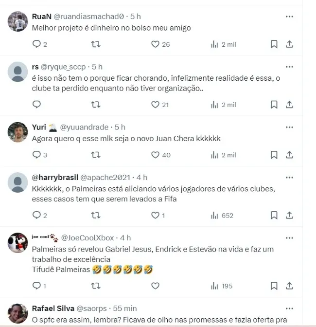 “Para minha surpresa, chegou esta semana pelo seu empresário, uma proposta feita pelo rival (Palmeiras) de R$ 15 mil de salário mais R$ 200 mil de luvas. Liguei para o presidente (Augusto Melo), que está em viagem… ficou abismado com isso, nunca vimos uma situação dessa”, finalizou.